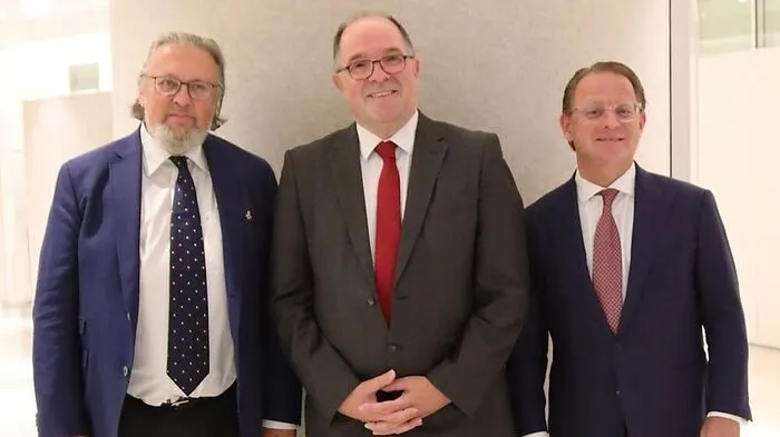 Lukas Held (rechts) von "hba Rechtsanwälte" hieß den Schweizer Botschafter Walter Haffner (mitte) und Honorarkonsul Georg Wolf-Schönach (links) herzlich im Haus willkommen