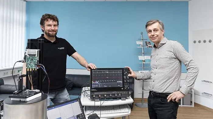 Stefan Dierer und Robert Okorn vor der Versuchsanordnung mit dem Infrarot-Laser und der Messelektronik in Kapfenberg. Leistungselektronik im Nanosekundenbereich
