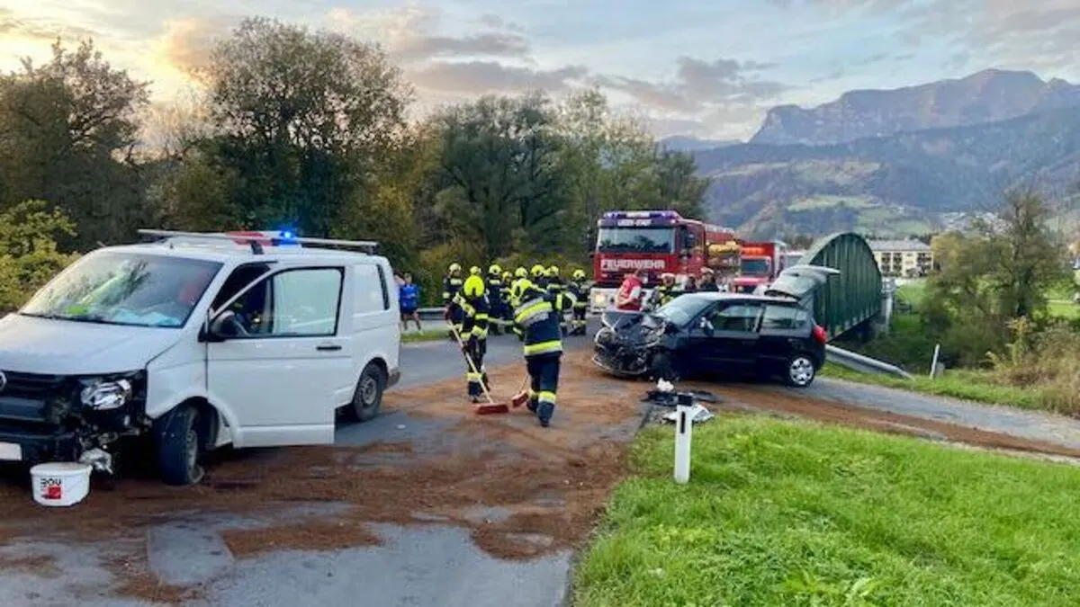 Unfall bei der Röthelbrücke bei Liezen: Kleinbus war auf die Gegenfahrbahn geraten, dort stieß er frontal in das Auto eines Mürztalers. Dessen Lenker wurde unbestimmten Grades verletzt.