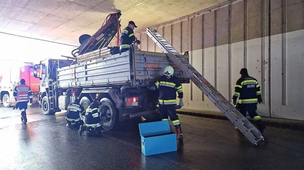 Der Lkw war in Kalsdorf mit einem nicht ganz eingefahrenen Ladekran in die Unterführung gefahren.