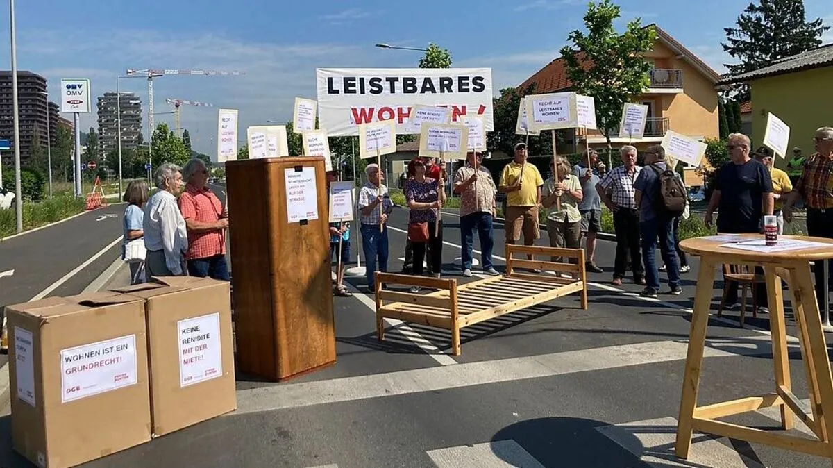 In Graz blockierten ÖGB-Pensionistinnen und -Pensionisten am Vormittag die Alte Poststraße. Damit wollten sie auf die steigenden Mieten und die fehlenden Gegenmaßnahmen der Regierung hinweisen.