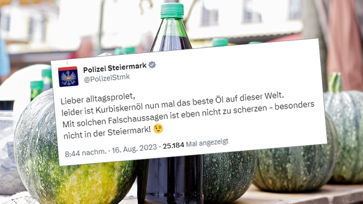 Als ein X-User einen nicht ganz ernst gemeinten Tweet über das steirische Kürbiskernöl absetzt, reagiert die steirische Polizei auf der Social-Media-Plattform mit Humor.