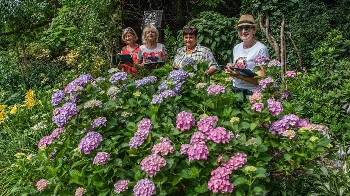 Alice Graf, Elfriede Fassel, Maria Kickmaier und Sabina Heinrich bei der Bewertung im Garten der Leitners