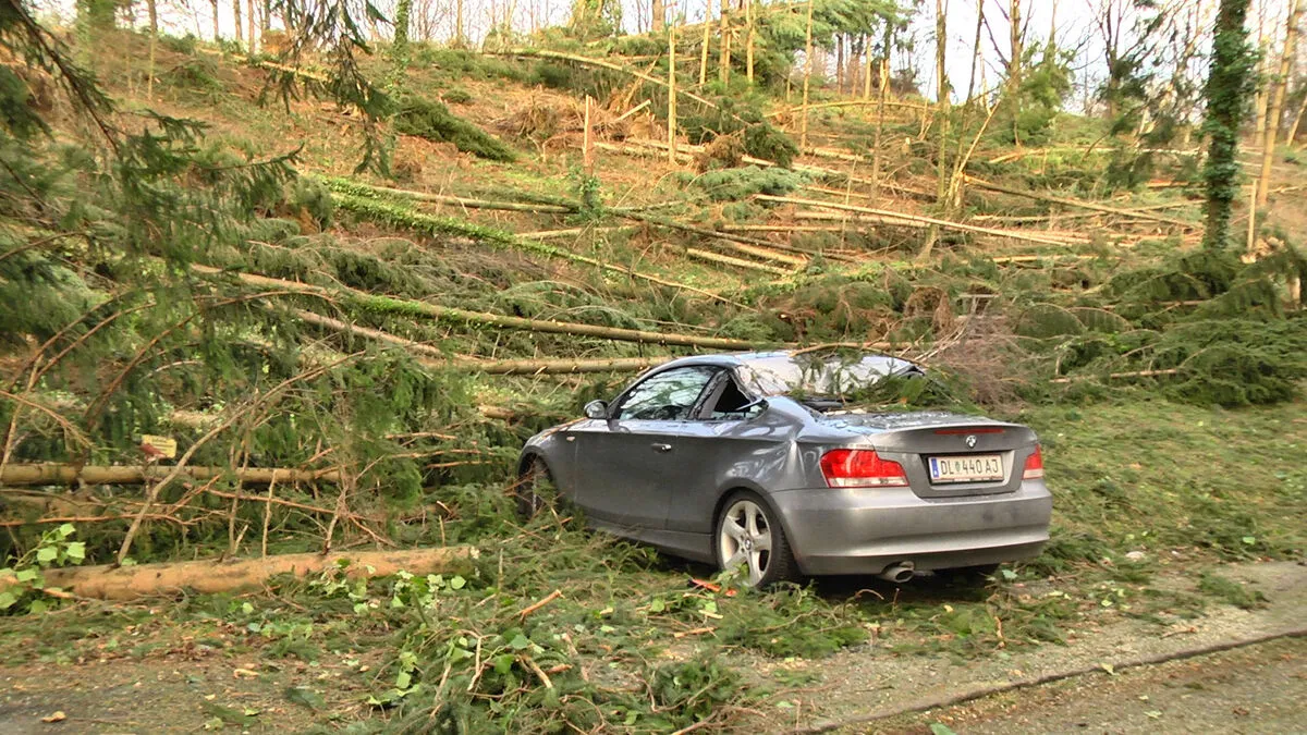 Die Feuerwehren im Bezirk Deutschlandsberg arbeiten gerade die Sturmschäden auf, etliche Bäume sind umgestürzt, sogar das Auto eines Feuerwehrmannes wurde durch einen Baum zerstört, dem Feuerwehrmann ist zum Glück nichts passiert.
