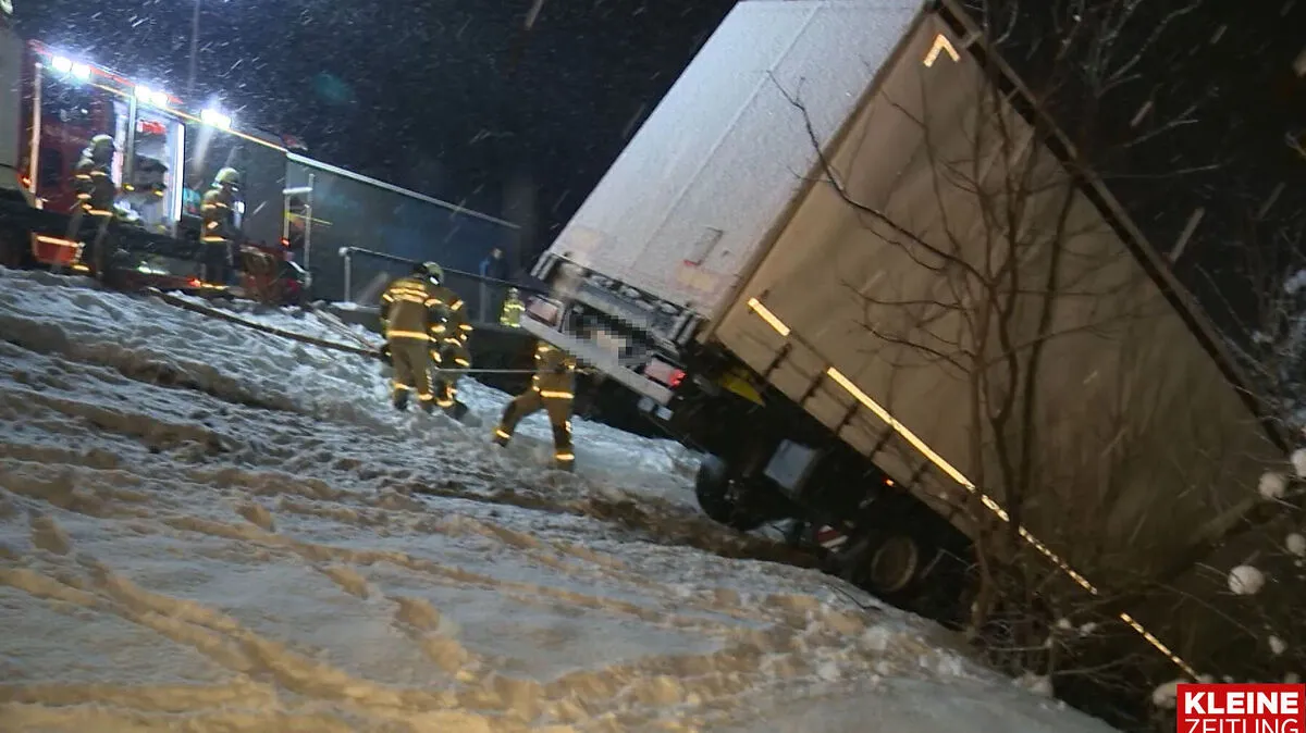 Ein slowenischer Sattelschlepper kollidierte auf der Ennstalbundesstraße, Höhe Schladming, mit einem Pkw und stürzte in Folge über eine Böschung.