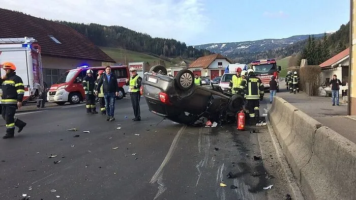 Junge Autofahrerin dürfte beim Einbiegen in die Obdacher Straße einen Lkw übersehen haben. Nach der Kollision kam ihr Auto am Dach zum Liegen - Hubschraubereinsatz.