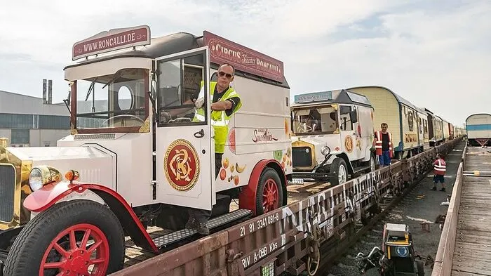 Ein 700 Meter langer Sondertransport mit 80 historischen Zirkuswagen brachte am Dienstag Bernhard Pauls Circus Roncalli in die Landeshauptstadt.
