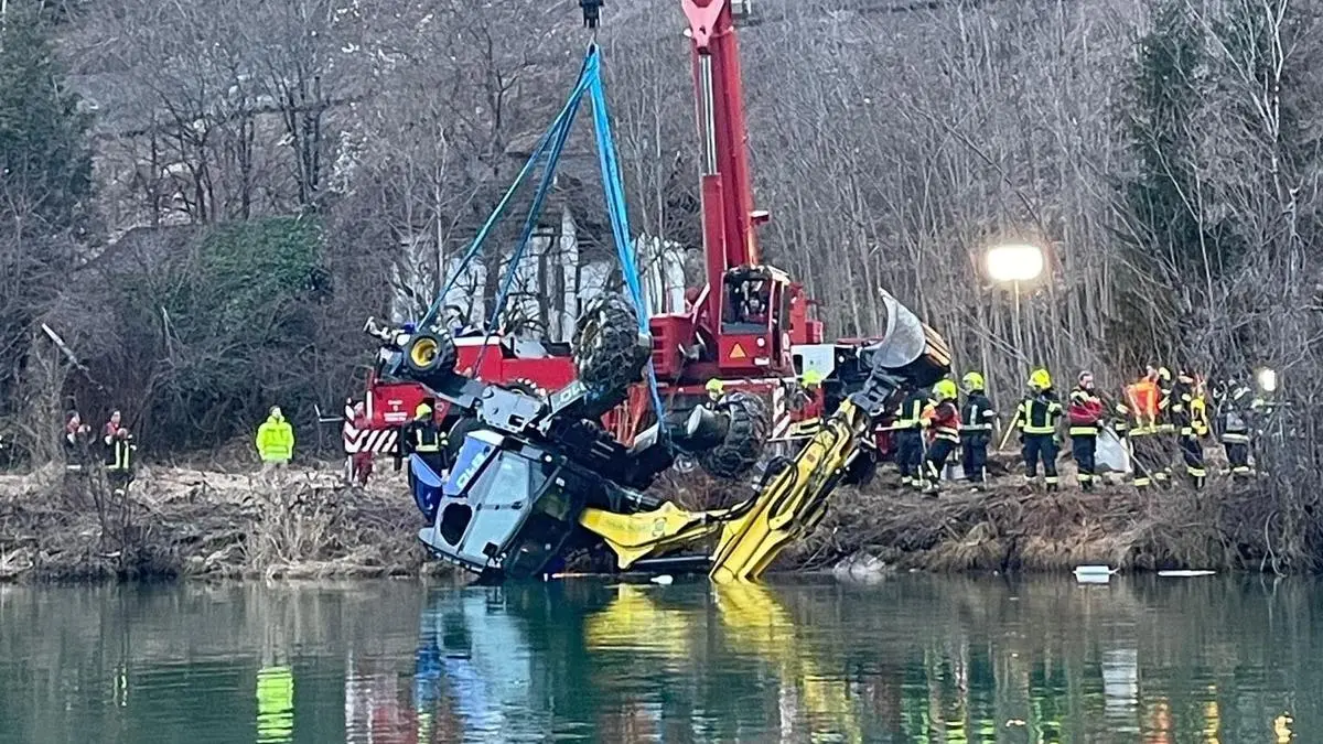 Bagger rutschte in die Enns, Lenker konnte sich mit Nothammer retten