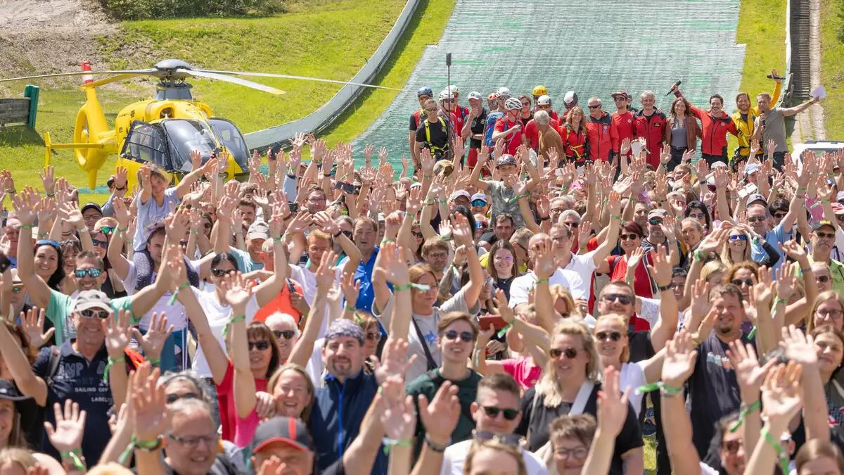 Hände hoch und jubeln: Die Fans der TV-Serie „Die Bergretter“ mit ihren Helden am Fuße der Ramsauer Schanze