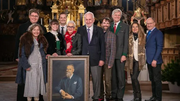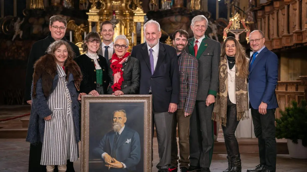 Pater Vinzenz Schager und Gröbmings Bürgermeister Thomas Reingruber (hinten), die Mayr‘schen Familienmitglieder Carmen Krisai-Chizzola, Theresa Haberl-Billroth, Sonja und Michael Haberl und Michael Billroth, Sepp Fegerl (Präsident der Internationalen Gesellschaft für Mayr-Medizin) und den Mayr-Ärzten Patricia Winkler-Payer und Henning Sartor
