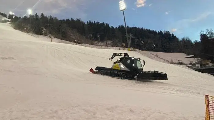 Pistengerät auf der Planai, das per Winde und Seil auf der aktuell noch gesperrten Talabfahrt unterwegs ist. Eine Begegnung damit kann tödlich enden