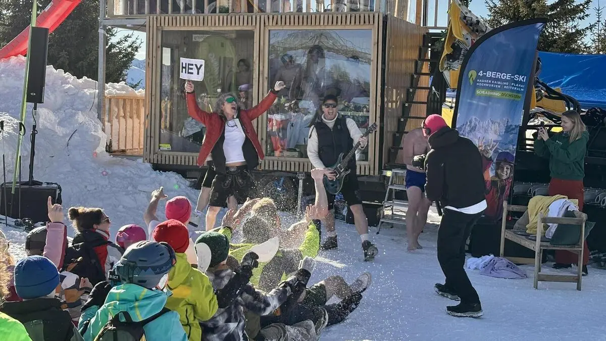 Die DIY-Tüftler und Social-Media-Stars präsentierten am Dienstag auf knapp 1900 Metern ihre selbstgebaute mobile Sauna. Mit Band und DJ wurde daraus eine Party bei Prachtwetter.