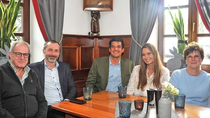Treffen im Gasthof Kamper in Admont: Seniorchef Albert Bacher, Bürgermeister Christian Haider, der neue Zahnarzt Jakob Götsch mit Lebensgefährtin Sarah, die bisherige Admonter Zahnärztin Beate Setaffy (v. li.)