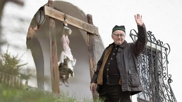 Ein älterer Herr in Knickerbocker geht ihnen entgegen. Er trägt eine schwarz-grüne Zipfelmütze und wird von jemandem begleitet, der auf den ersten Blick wie ein Metzger aussieht. Vor der Haustür hängt ein halb gehäuteter Hase. Von Weitem betrachtet gibt die Szene einige Rätsel auf.