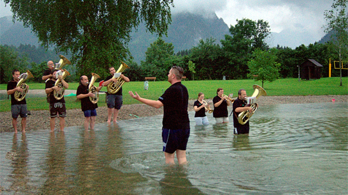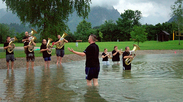 Videotrend schwappt in die Steiermark über: Musikkapellen stellen sich der "Cold Water Challenge" und marschieren ins kühle Nass. Von Christian Penz.
