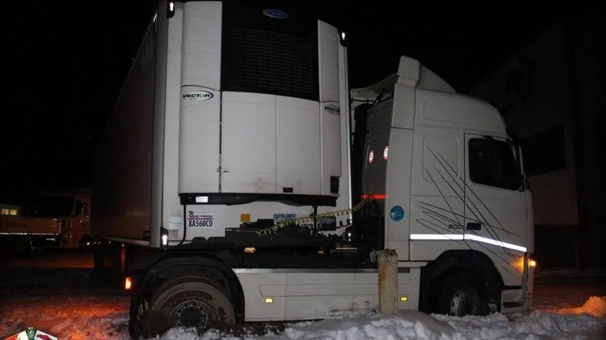 Der Laster war Montagabend in Aich von einem Parkplatz in eine schneebedeckte Wiese gerutscht.