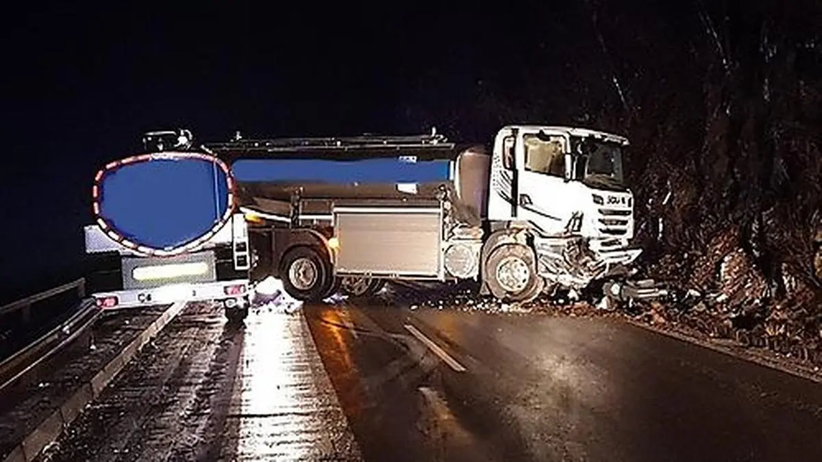 Der Lenker des Schwerfahrzeuges hatte am Samstag gegen 18.45 Uhr auf der glatten Straße die Kontrolle über den Lkw verloren und schlitterte unkontrolliert einige Meter eines steilen Straßenstückes der B115 entlang. Der Lkw drehte sich ein, der Anhänger riss einige Verankerungen der Leitschiene auf der gegenüberliegenden Fahrbahn ab und wurde mit den beiden linken Rädern, frei in der Luft hängend zwischen dem Geländer eingeklemmt. Somit blockierte das Gespann die gesamte Fahrbahn der B115. Der Lkw-Lenker blieb unverletzt.