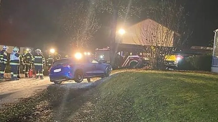 Unfall im Ortsgebiet von Weng (Gemeinde Admont) am Montag, Auto begann nach Kollision mit Laterne und Böschung zu brennen.