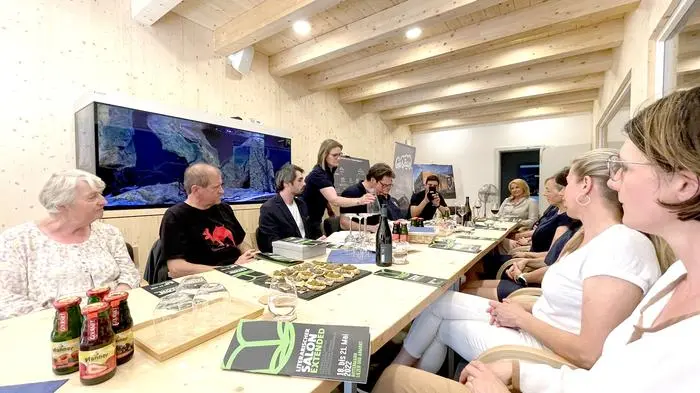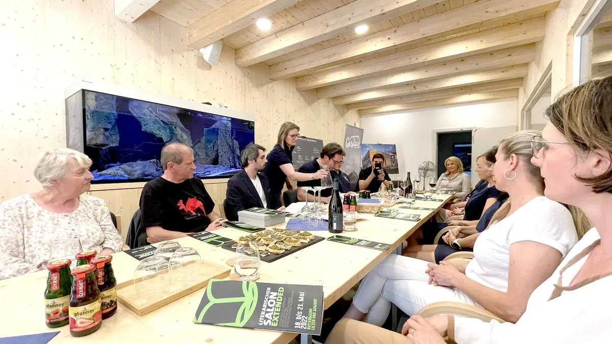 Im Seminarraum der Garnelen-Produktion und -Zucht "White Panther" tummelten sich im großen Aquarium lustig Garnelen, ließen sich auf und ab schweben, während Autor Leander Fischer aus seinem voluminösen Monumentalwerk "Die Forelle" las und die Zuhörer nicht nur durch den Text, sondern auch durch seine atem- und ansatzlose Vorlesekunst in merkbar leises Staunen versetzte.