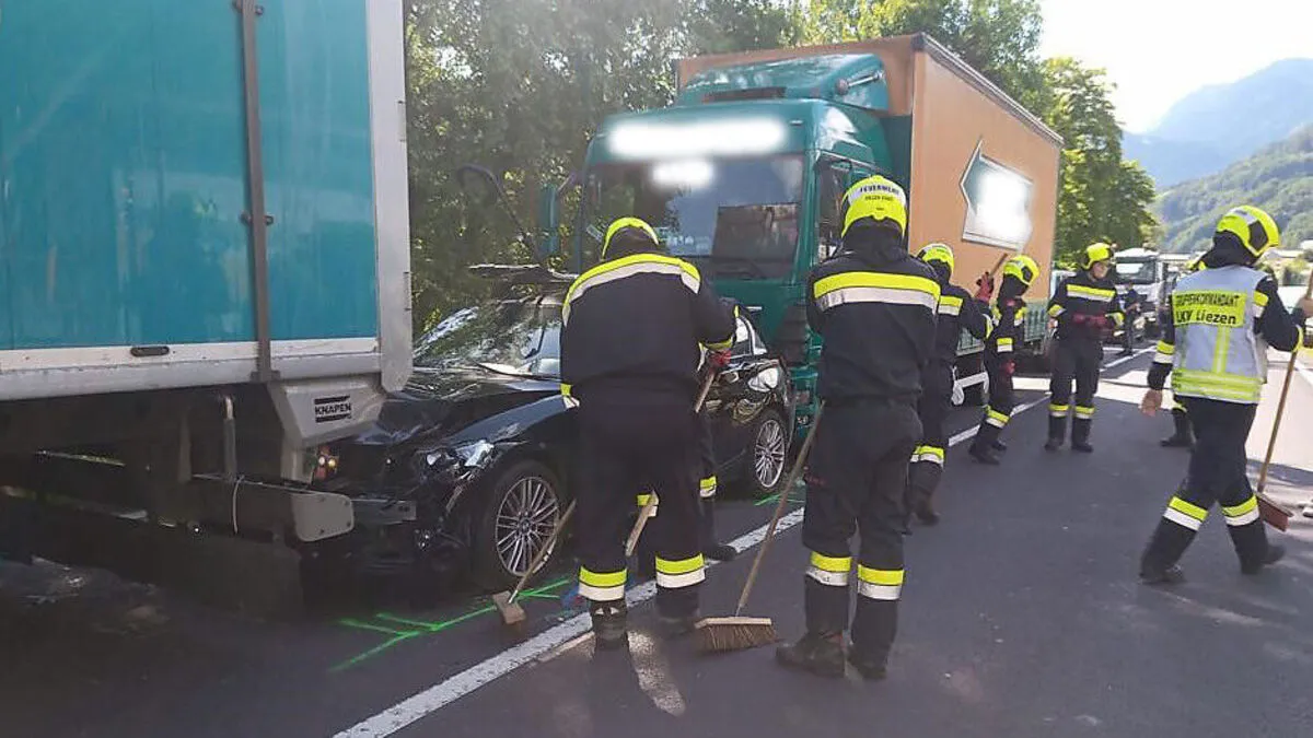 Pkw zwischen zwei Lkw eingeklemmt: Zwei Männer verletzt