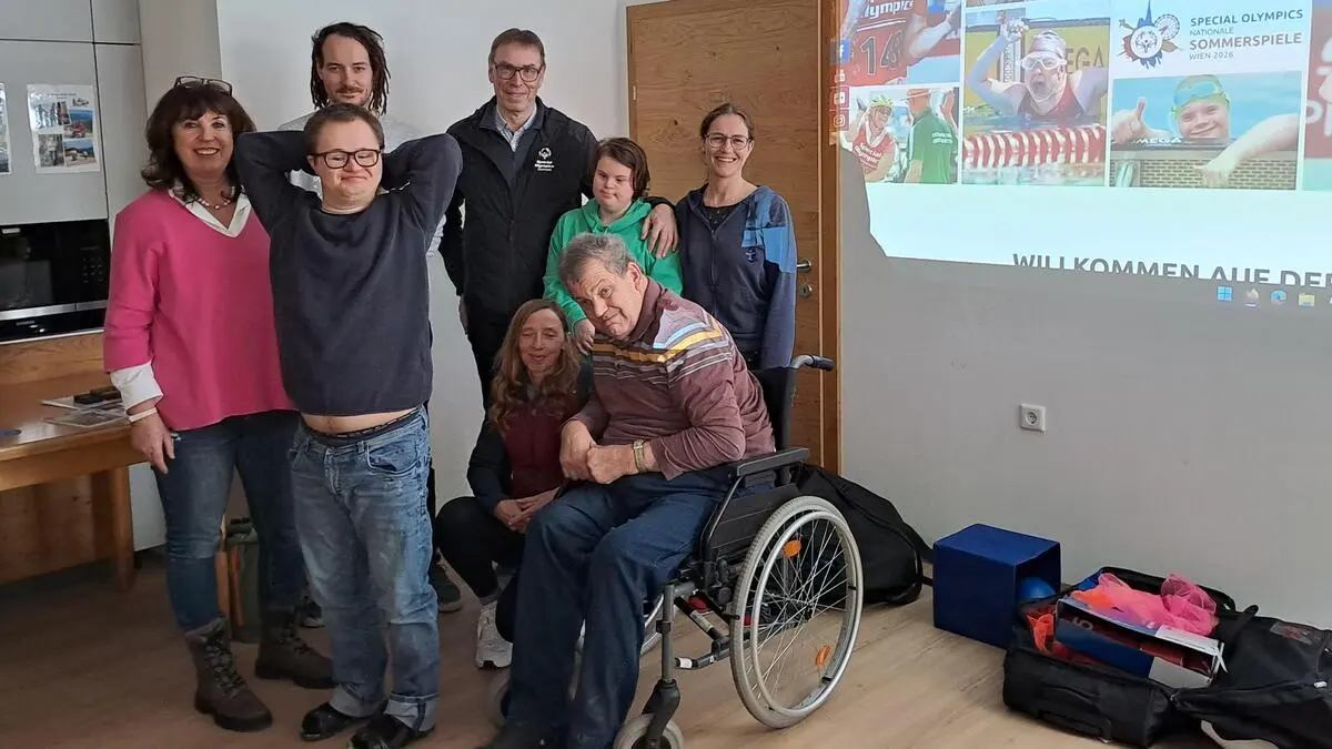 Diakoniewerk-Ennstal-Leiterin Andrea Stieg, Trainer Thomas Gruber, Kurt Pfleger (Vizepräsident Special Olympics Österreich), Leonie und Christine Höflehner (hinten) sowie Raphael, Elfriede Weinzierl (Geschäftsführerin Special Olympics Steiermark) und Werner