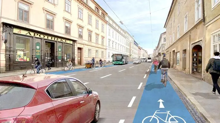 Es hatte das Potenzial zur Posse, jetzt ist aber eine Vorentscheidung gefallen: Laut Landesbehörde darf die Heinrichstraße im Sinne der Radoffensive genau so umgebaut werden, wie es im Vorjahr geplant wurde. Das bedeutet: Rund 50 Autoparkplätze kommen zwischen Geidorfplatz und Mozartgasse weg, dafür erhalten Radfahrer mittels blau markierten Streifen links und rechts erstmals eine eigene Fläche. Land und Stadt hatten das geplant, einige Anrainer machten dagegen aber mobil – und haben damit ein Behördenverfahren erwirkt.
