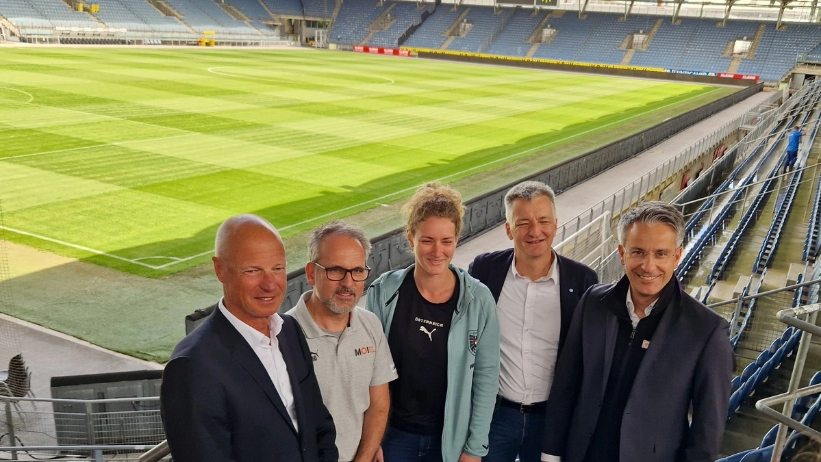 Stellten am Mittwoch das Projekt für Graz vor (von links): Gerald Pototschnig (Stadionmanager), Thomas Jäger (MOI), Julia Hess (ÖFB), Manfred Eber (KPÖ), Kurt Hohensinner (ÖVP)