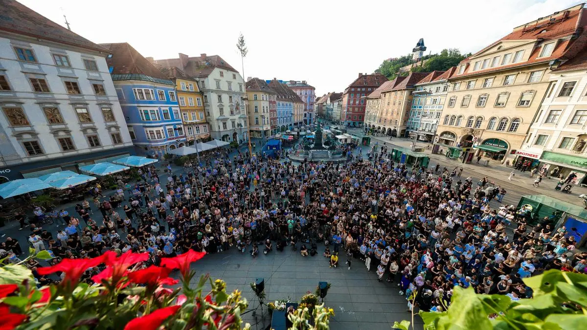 Im Hintergrund brennen die Kerzen, die für die Opfer des Amoklaufs in Graz angezündet wurden. Über den Köpfen weht am Mittwochabend die schwarze Trauerfahne am Hauptplatz. Eine junge Frau klammert sich in Tränen an einen älteren Mann. Eine andere kniet schluchzend vor den Lichtern, die Hände fest um eine brennende Kerze geschlossen. Ihre Gesichter zeigen den Schmerz, den die meisten Menschen am Hauptplatz teilen.