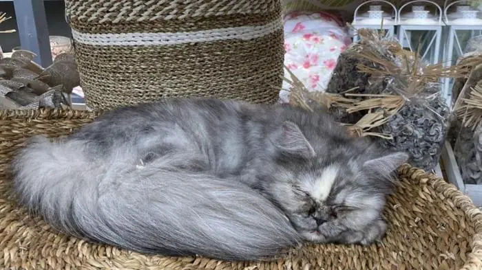 Hermine hat es sich gemütlich gemacht. Sie liegt eingerollt in einem Strohkörbchen. Ihren grauen, flauschigen Schwanz hat sie um sich geschlungen. Sie ist zu Hause. Zu Hause bei Bellaflora in der Filiale in Graz-St. Peter.