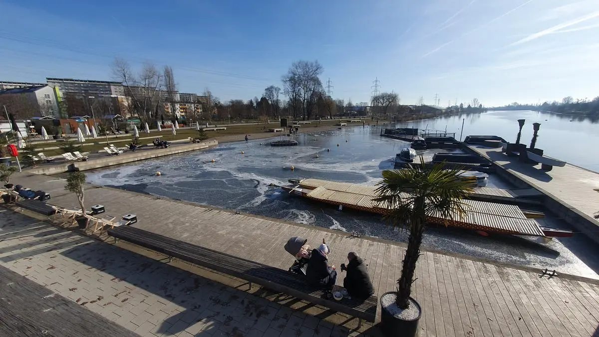 Nicht nur der Hilmteich ist zugefroren und fürs Eislaufen freigegeben, auch die Mur hat beim Stadtstrand eine Eisschicht und lockt viele Neugierige – dort ist es aber gefährlich.