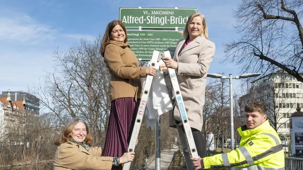 Die Augartenbrücke wurde nach dem 2025 verstorbenen Grazer Altbürgermeister Alfred Stingl benannt. Am heutigen Freitag wurden die Schilder enthüllt.