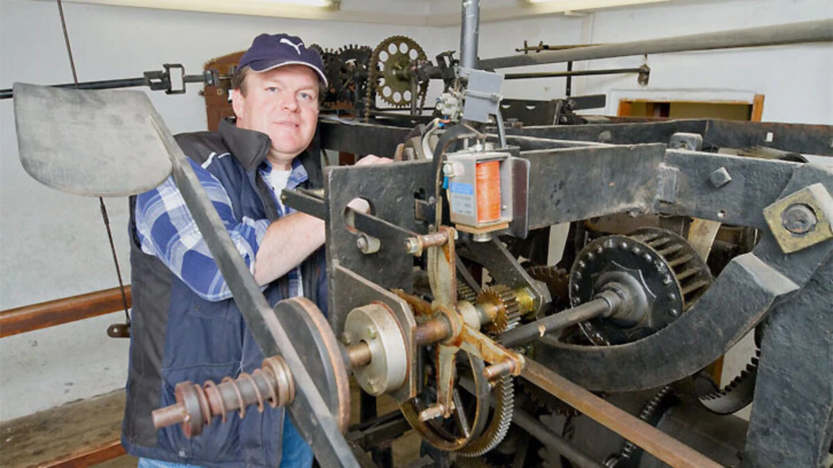 Josef Reicht wartet die Uhrturm-Uhr. Auch zur Zeitumstellung am Sonntag.