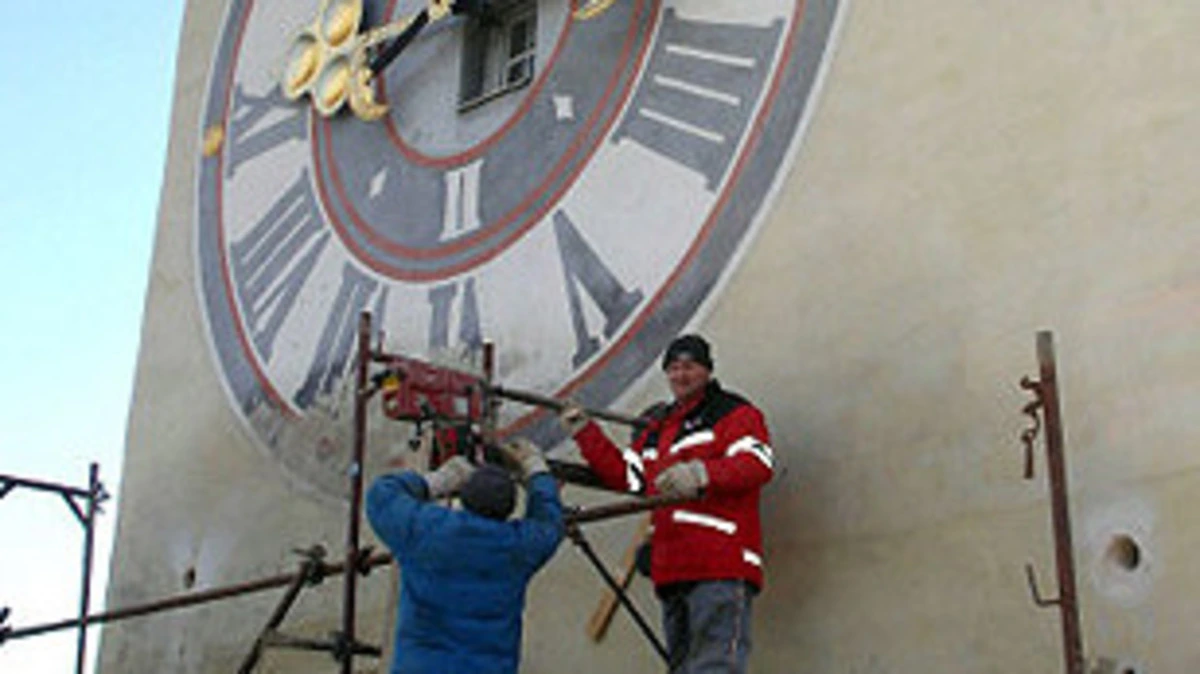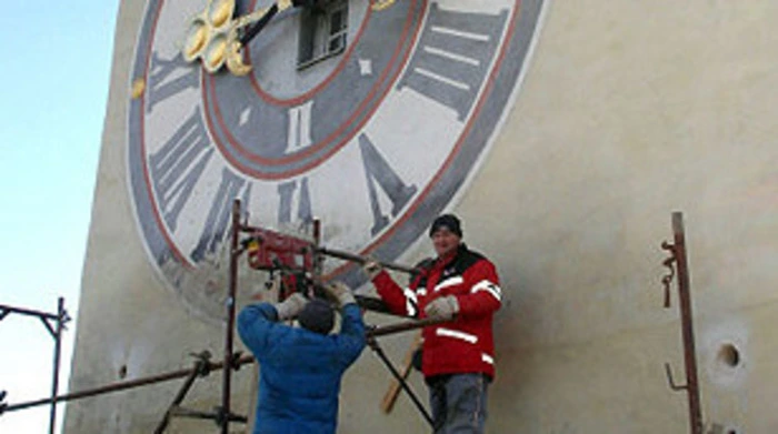 Mit Kernbohrungen in das mehrere Meter dicke Mauerwerk wurde am Montag die dringend notwendige Sanierung des Uhrturms gestartet.