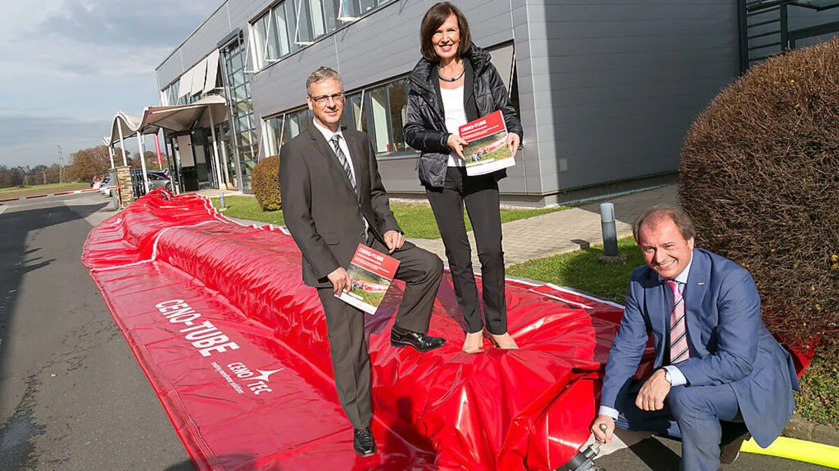 Mit „Ceno Tubes“ will die Sattler AG den Hochwasserschutz revolutionieren. Mit dem System kann von vier Helfern binnen einer Stunde ein Schutzdamm aufgestellt werden. Damit ist es viel effizienter als die üblichen Sandsäcke. Von Roman Vilgut