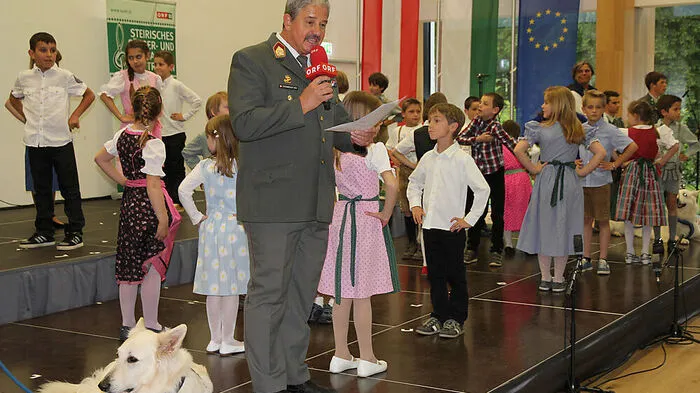 Seit zehn Jahren organisiert Oberst Albin Stromberger Volksmusik-Abende und unterstützt damit die Hundetherapie an einer Grazer Integrations-Volksschule. Auch heute wird wieder gespielt und gesungen.