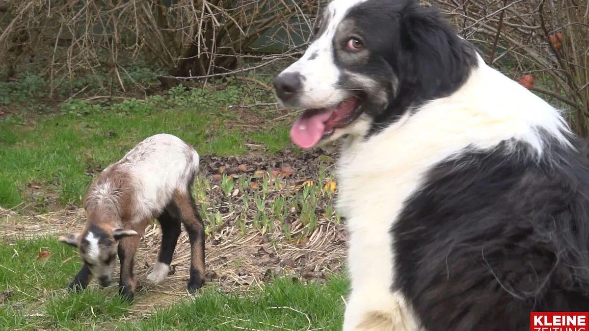 Im Tierheim "Purzel & Vicky" kümmert sich Hündin "Luna" um das kleine Lamm "Angelo", das von seiner Mutter verstoßen wurde.