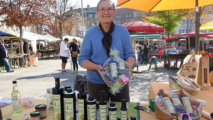 Wer eine nette Idee für ein Geschenk sucht, kann Helene Gartler an ihrem Marktstand besuchen: Die Landwirtin verkauft vor allem Kernöl und Kürbiskern-Produkte.
