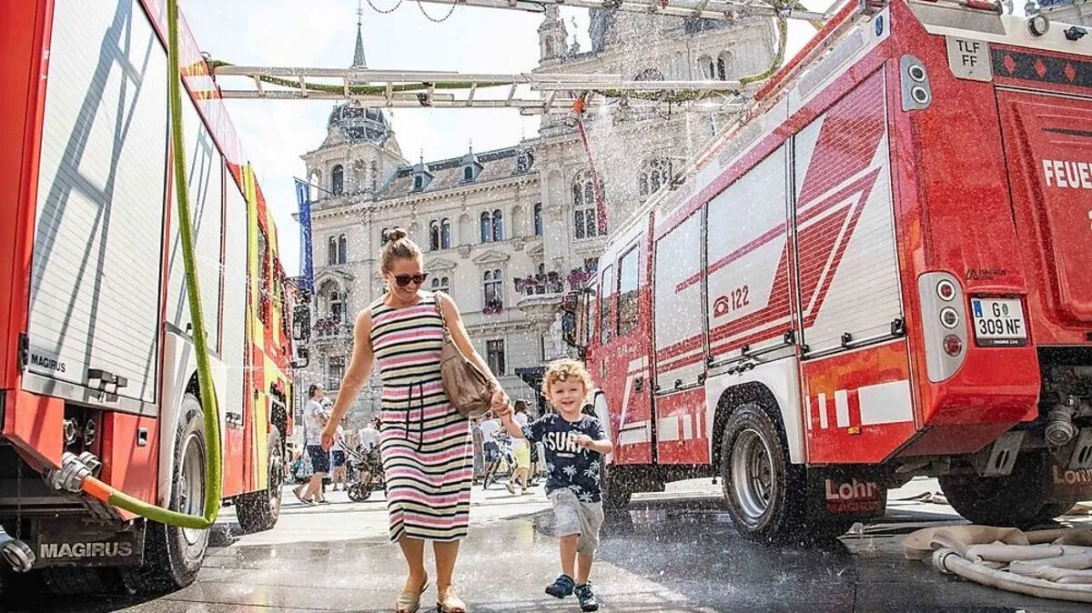 Behelfsmäßig rückt die Feuerwehr in Graz aus, um zumindest am Hauptplatz für Abkühlung zu sorgen