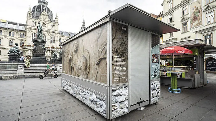 Am Grazer Hauptplatz bieten die Marktstände nun Posterflächen für die beliebtesten Sehenswürdigkeiten der Stadt. Dafür musste allerdings ein Kunstprojekt weichen.