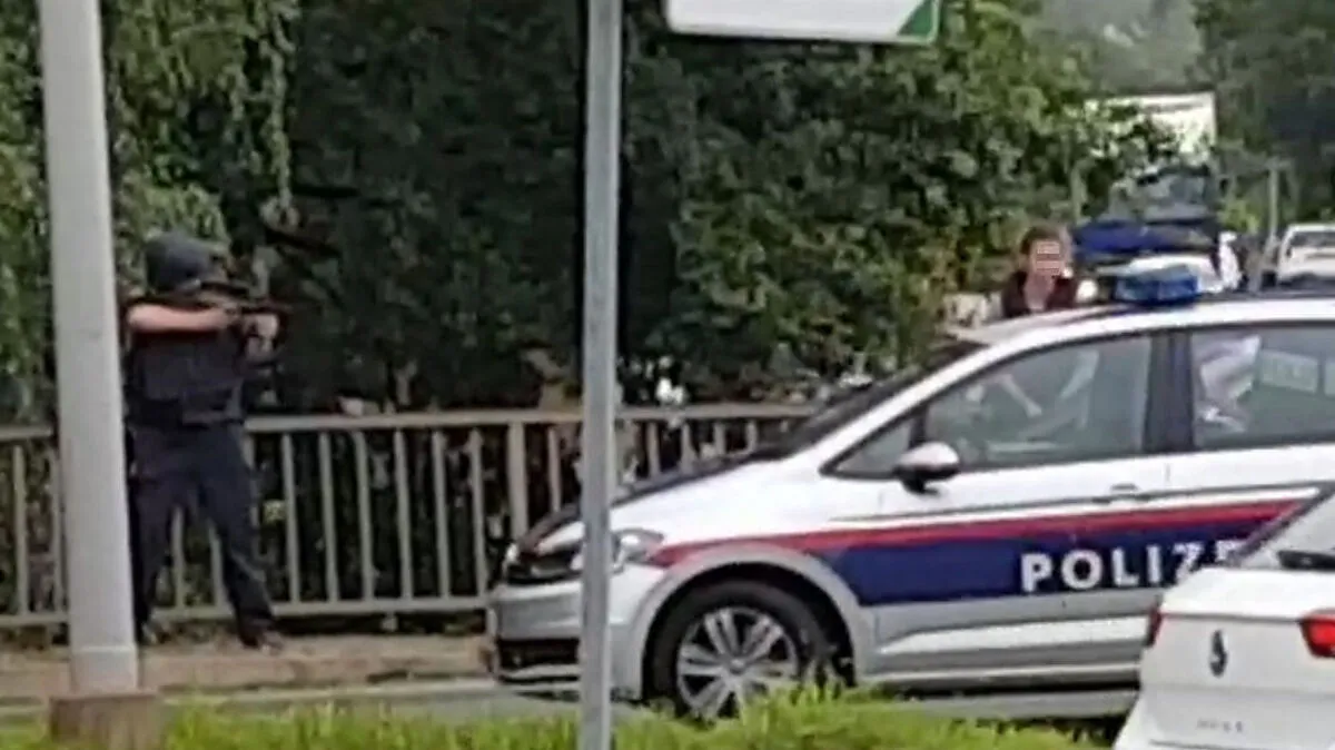Wiener Straße nach dem Banküberfall: Ein Polizist überwacht den Autoverkehr - mit einer Maschinenpistole (links)