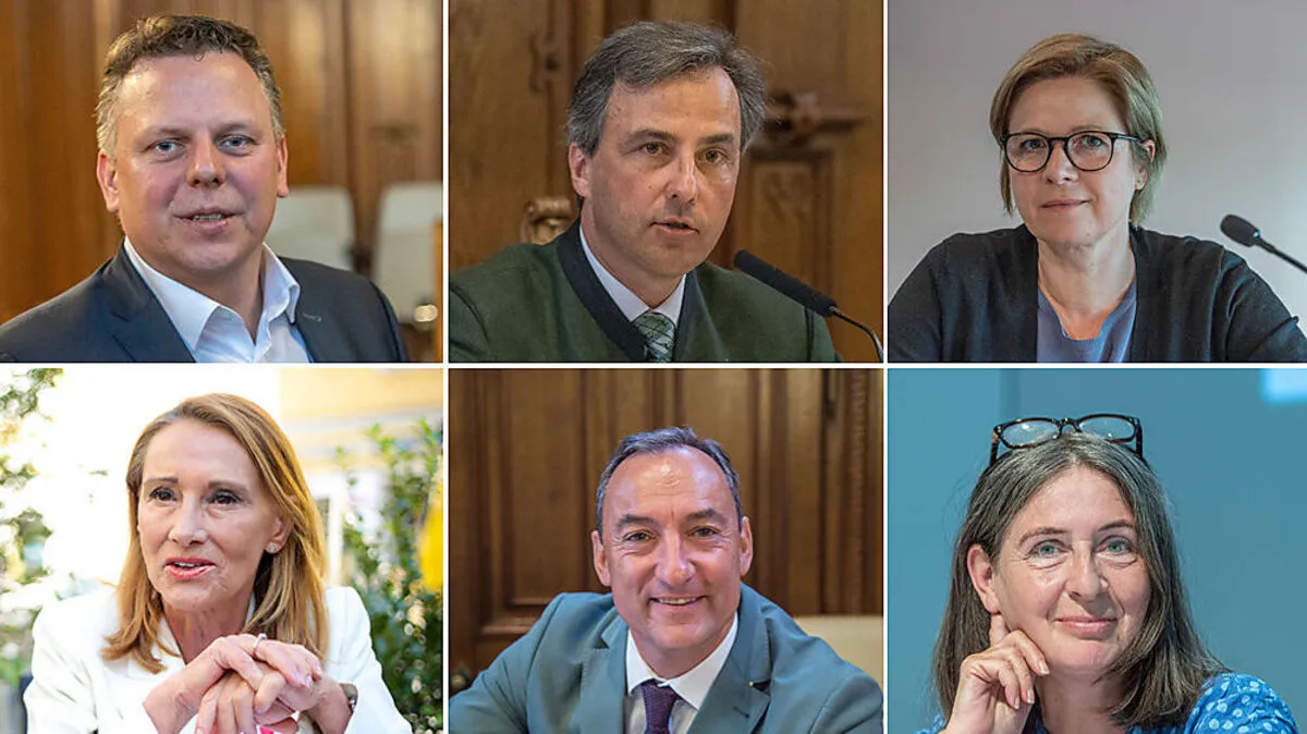 Die Grazer Parteichef, von links oben beginnend: Michael Ehmann (SPÖ), Siegfried Nagl (ÖVP), Judith Schwentner (Grüne), Sabine Reininghaus (Neos), Mario Eustacchio (FPÖ) und Elke Kahr (KPÖ)
