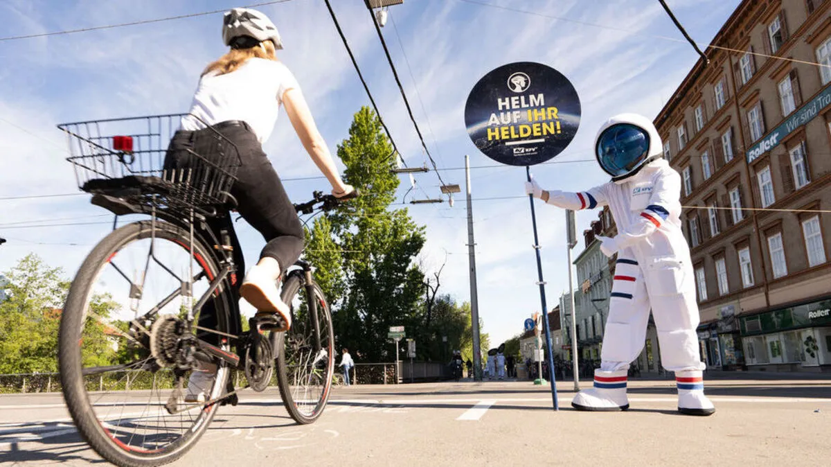 In der Grazer Innenstadt sind seit Dienstag Astronauten unterwegs. Ihre Mission: auf die Notwendigkeit eines Fahrradhelms hinzuweisen und so Unfällen und Stürzen mit schweren Kopfverletzungen vorzubeugen.