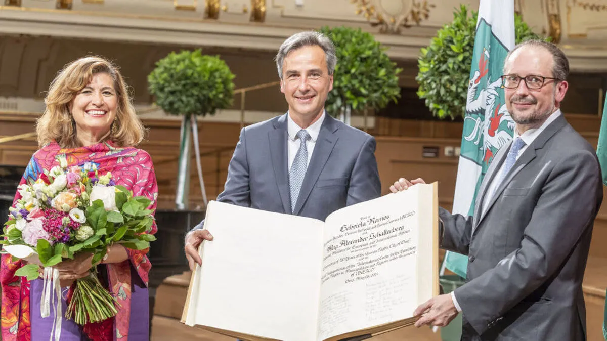 Außenminister Alexander Schallenberg und Unesco-Vertreterin Gabriela Ramos kamen am Dienstag zum Festakt nach Graz. Damit wurde auch das Unesco-Trainingszentrum für Menschenrechte offiziell eröffnet - es ist erst weltweit das zweite dieser Art.