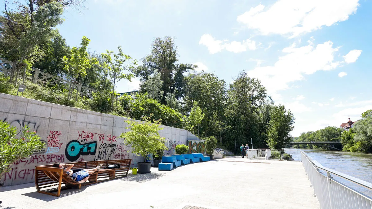 Die Plattform an der Mur bei der Radetzkybrücke wird erst 2023 finalisiert. Sie soll zur konsumfreien, beschatteten Ruhezone werden. Zum Ferienstart gibt es nun erneut eine provisorische Lösung.