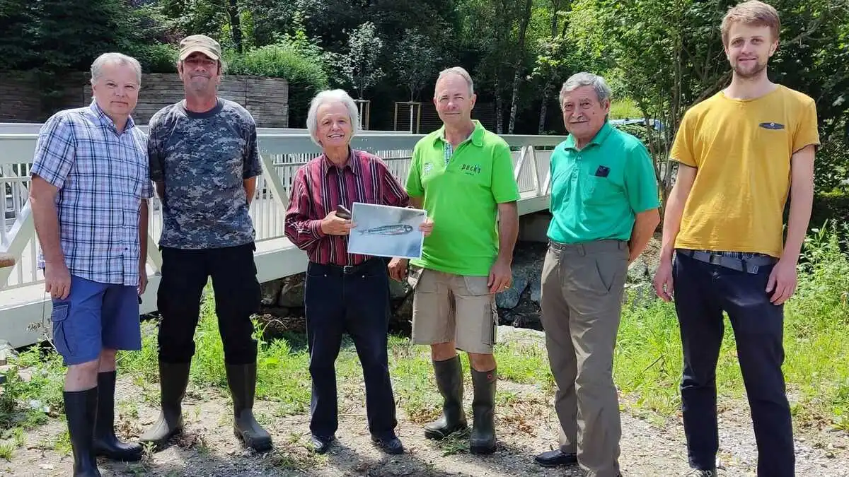 Besatz der Elritzen im Ragnitzbach: Bezirksvorsteher und Fischereiaufseher Josef Schuster, Ökologe Albert Rechberger, Naturschutzbund-Präsident Johannes Gepp, Fischzüchter Thomas Pock Joe Tertinegg und Oliver Zweidick (Naturschutzbund-Projektleiter)
