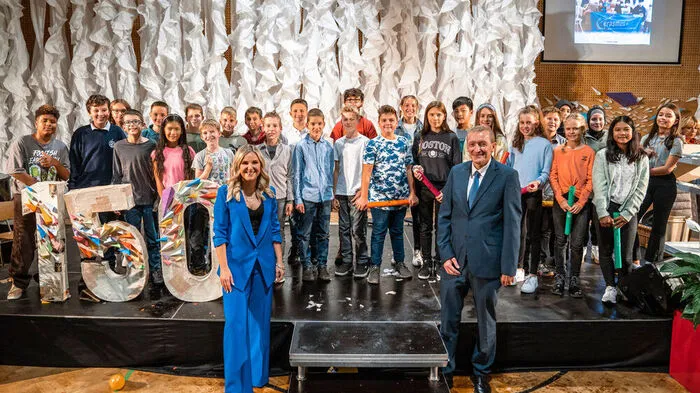 Zum Abschluss des Festakts gaben die Kinder – im Bild mit Moderatorin Natalie Hemmer und Direktor Franz Riegler – noch den neuen Kepler-Song zum Besten