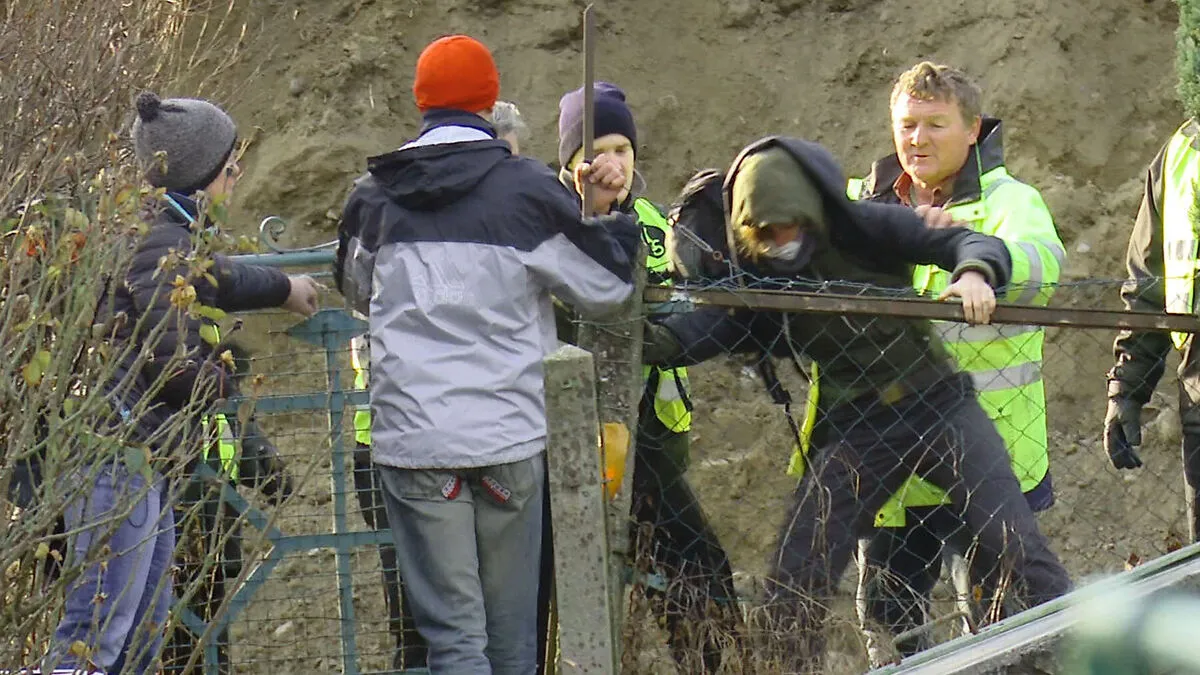 In der Früh haben sich einige Menschen in der Nähe der Baustelle des Murkraftwerks versammelt, um dem Bau vorübergehend zu stoppen. Über einen Schrebergarten drangen sie auf das Gelände vor, Securities haben versucht, dagegen vorzugehen.