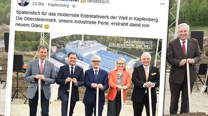 Gemeinsam regieren, getrennt schaufeln: Schickhofer postete das Bild mit Kapfenbergs Bürgermeister Fritz Kratzer, LH-Stv. Schickhofer, Vorstandsvorsitzender Eder, Ministerin Schramböck, Vorstand Rotter ohne Schützenhöfer (rechts der weggeschnittene Teil)