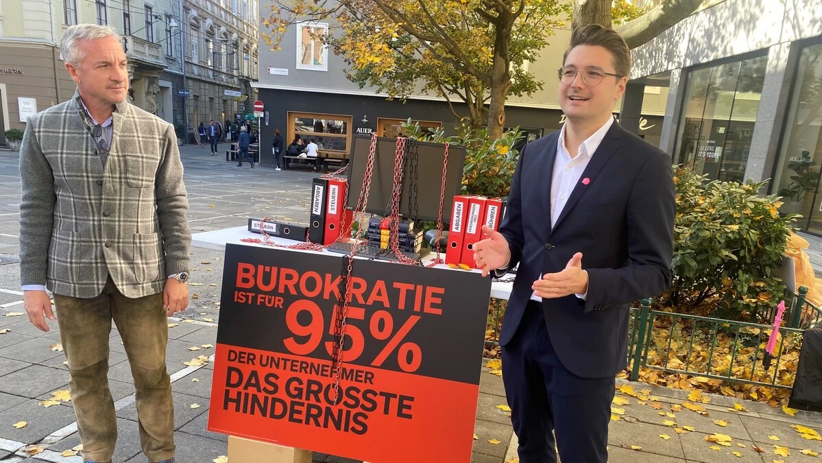 Landtagswahl: Mit dem Grazer Unternehmer Kovac an der Seite geißelt Neos-Spitzenkandidat Swatek die Bürokratie. Am Ende muss ein Seitenschneider  her.