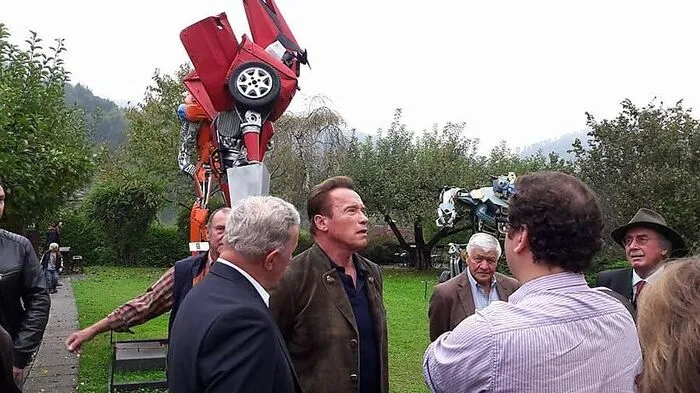 Arnold Schwarzenegger machte einen Abstecher in sein Museum in Thal bei Graz, wo gerade Skulpturen aus Schrott für Aufsehen sorgen.